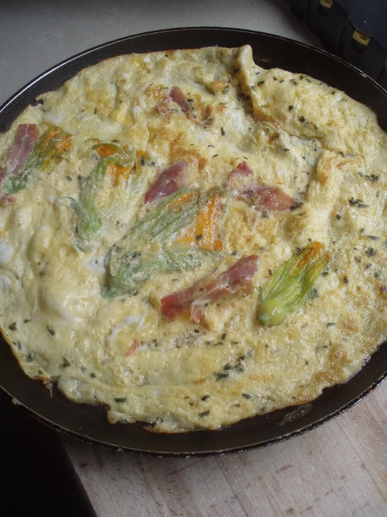 S obzirom na odličnu cijenu cvjetova tikvica (koji se inače na menijima svjetskih restorana znaju pojavljivati kao poprilično skupa predjela) od 2 kn za 5 cvjetova pa još uzevši u obzir da je žena na placi bila poznanica moje babe i da mi je u saket (hrv: vrećicu) gurnula cijeli buket cvijeća, trebalo je to iskoristiti. Ova fritaja je bila odličan način za to – lagan i ukusan ručak. (ovo je sve bilo zadnji put kad sam vam pisala o pohanim cvjetovima tikvica, ali nisam stigla prije pisati i o ovome)