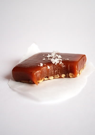 Dobivenu mješavinu pažljivo izlijte u pripremljeni pleh i ostavite da se hladi bar dva sata. Režite nožem umočenim u vruću vodu, kockice pospite krupnom morskom soli i zamotajte u komadiće papira za pečenje.
